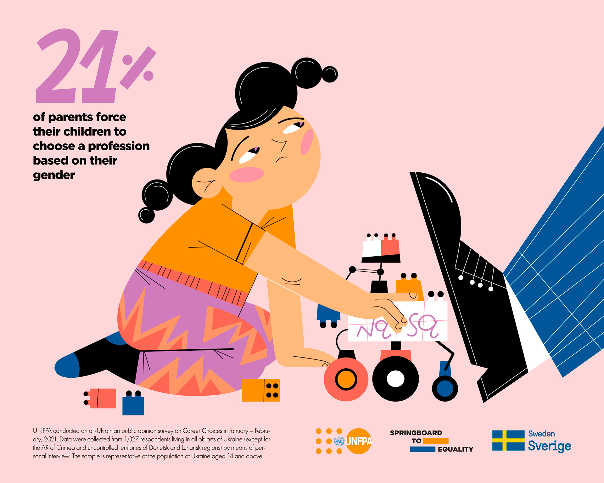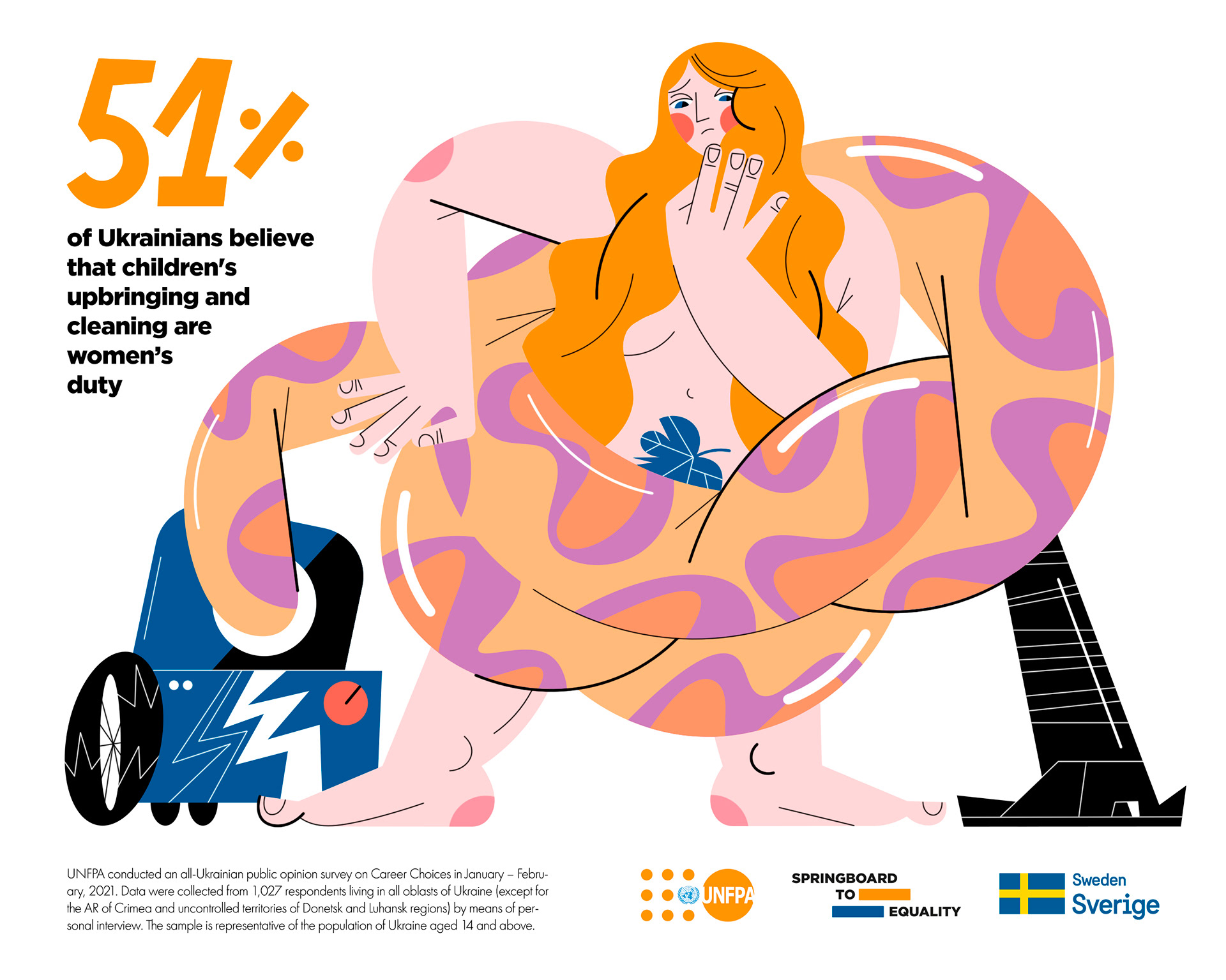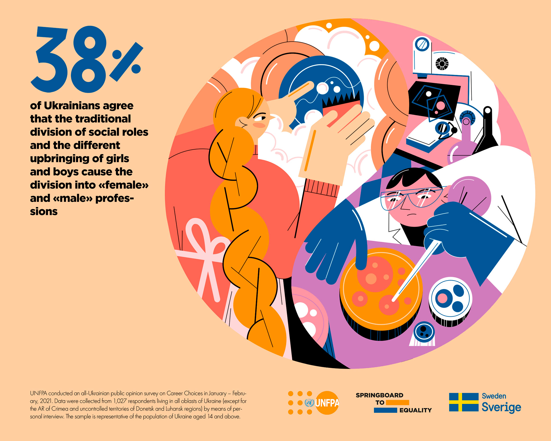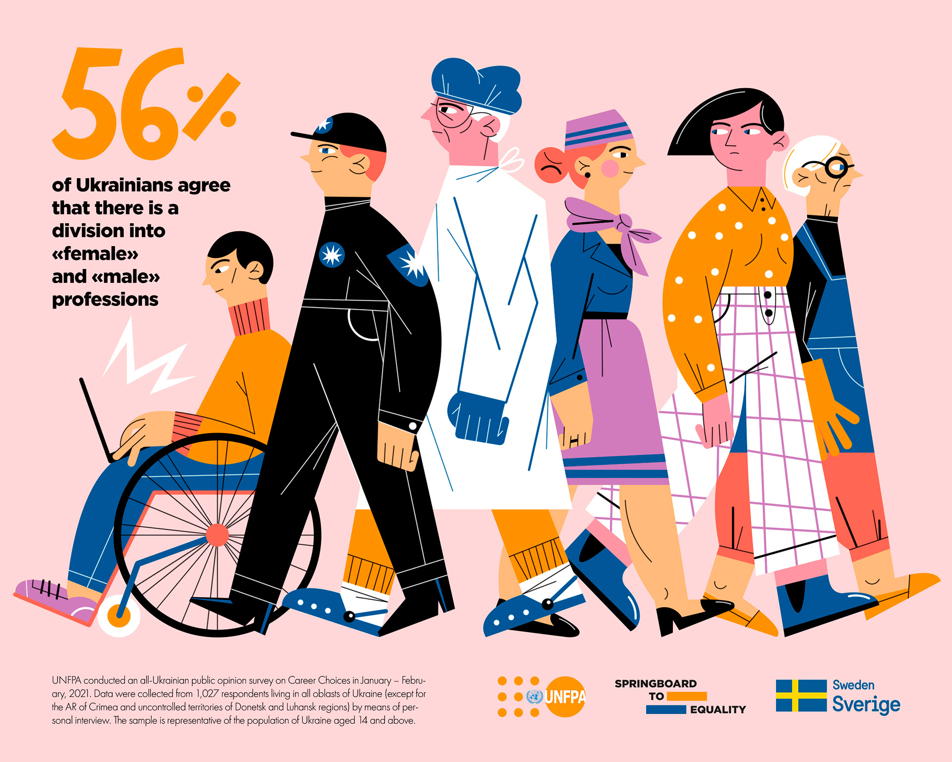 Illustrations and layout for United Nations Population Fund campaign on gender stereotypes about career and occupation.