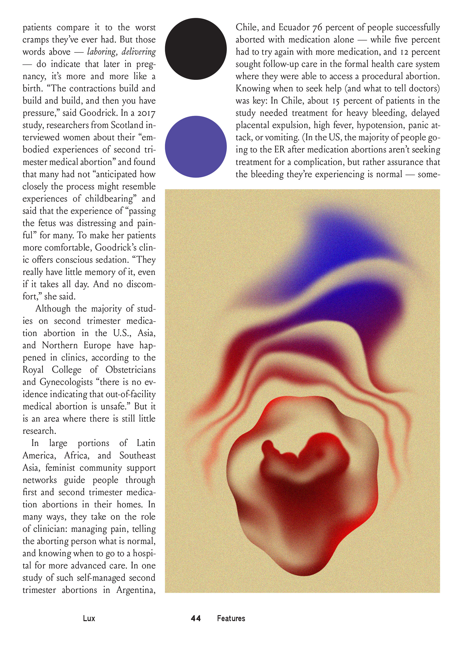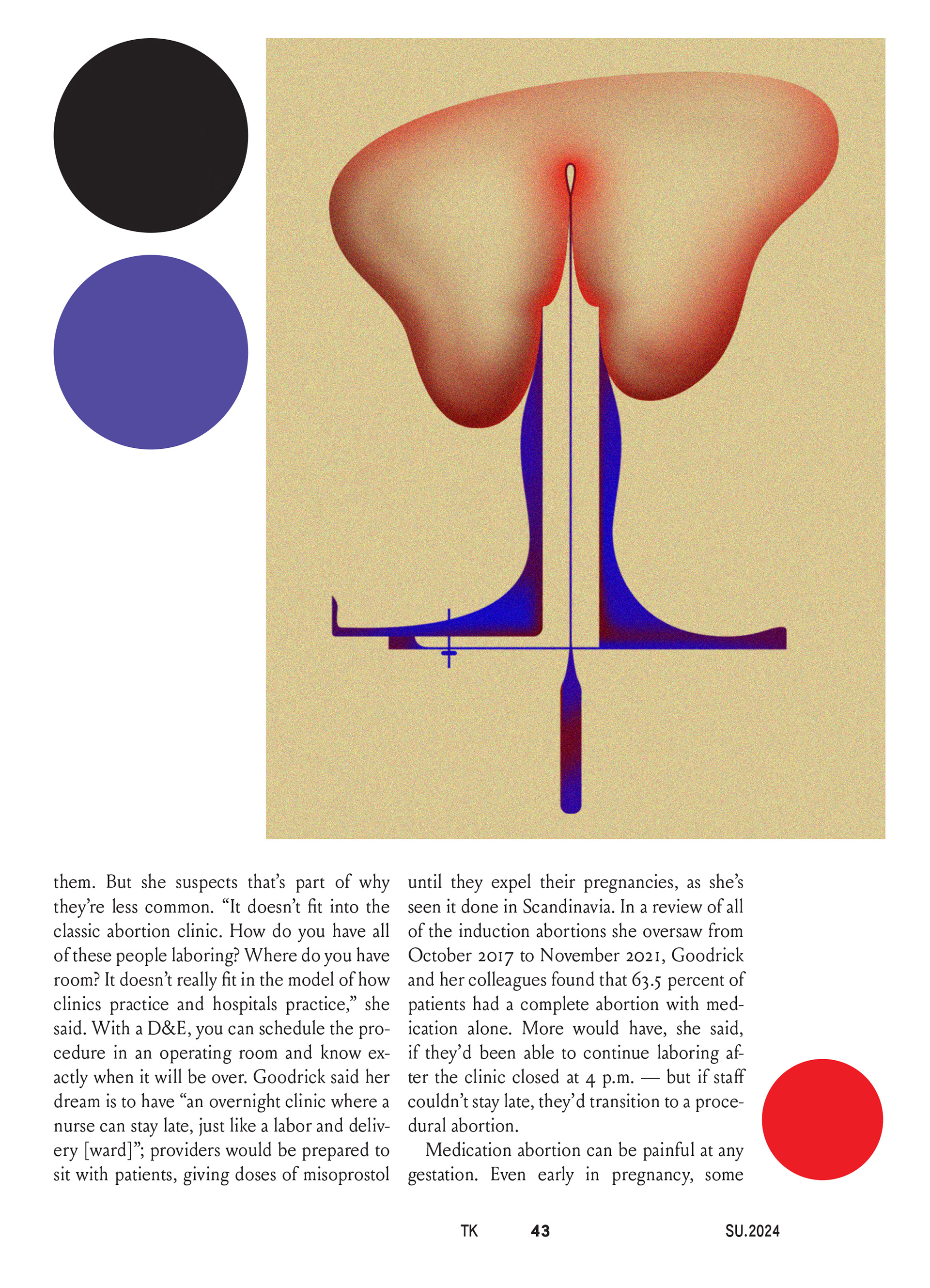 Illustrations for the Lux magazine piece about the ban on mifepristone, the abortion pill, in the second trimester in the US, and about the luxury of having time to decide to terminate pregnancy and make the procedure.